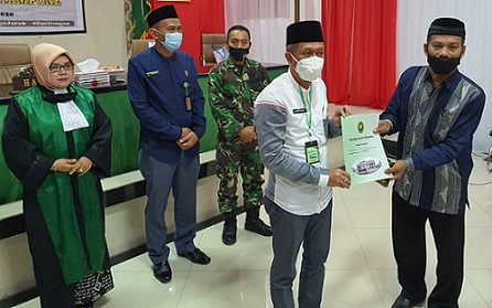 Penyerahan Penetapan Isbat Nikah oleh Panitera, Sudirman, S.H., kepada Drs. H. Andi Islamuddin secara simbolis