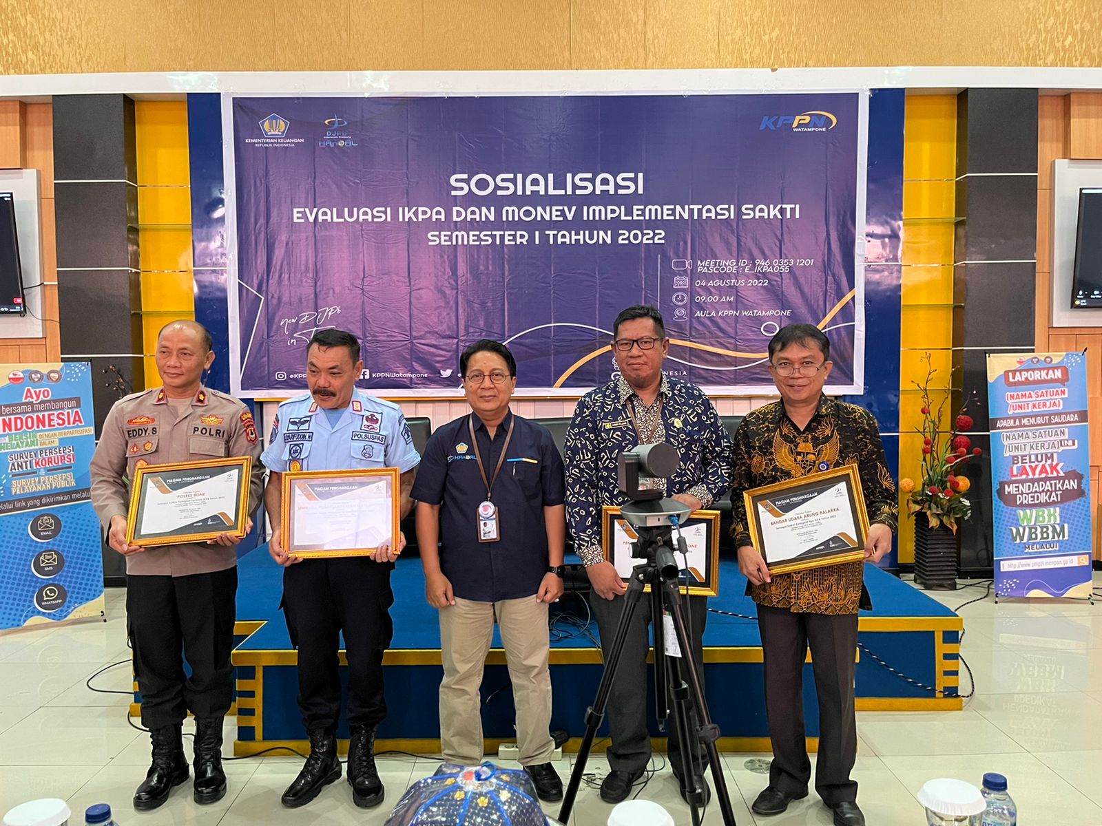 Penghargaan diberikan pada acara Sosialisasi Evaluasi IKPA dan Monev Implementasi SAKTI Semester I Tahun 2022 yang diselenggarakan oleh KPPN Watampone pada Hari Kamis, 4 Agustus 2022 di Aula KPPN Watampone.